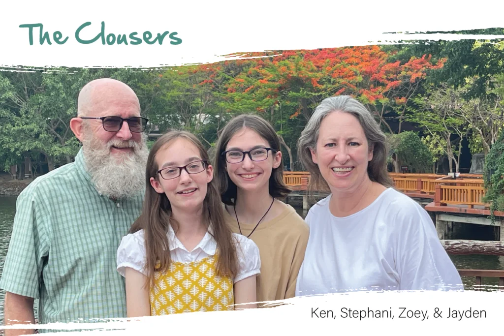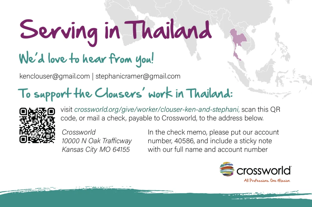 We look forward to seeing our two pups again and starting a new school year. Zoey will be a senior, Jayden will be a sophomore, and Stephani will teach two of the same classes (yah, for a year of repetition!) she taught last year. Ken’s life and rhythm aren’t dictated by the school year, so he will be continuing to build relationships with our neighbors, be the family chauffeur, and begin to find out how God is going to use him to serve Burmese refugees in northern Thailand as well as other missionaries who work with our organization.